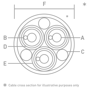 E) Jacket: PVC is used as the outer jacket to give a high degree of flexibility and mechanical damping and strength.