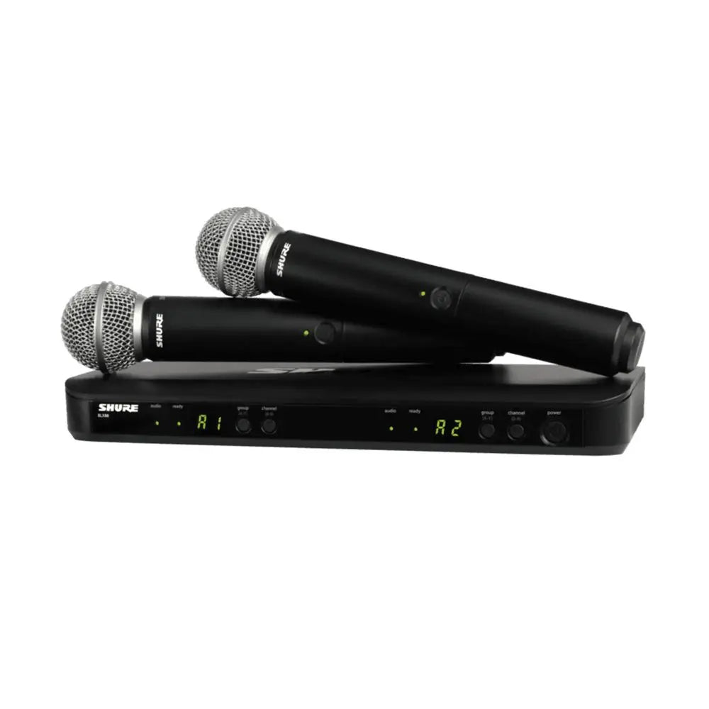 - Dual BLX2 handheld transmitters with PG58 vocal microphone cartridge.